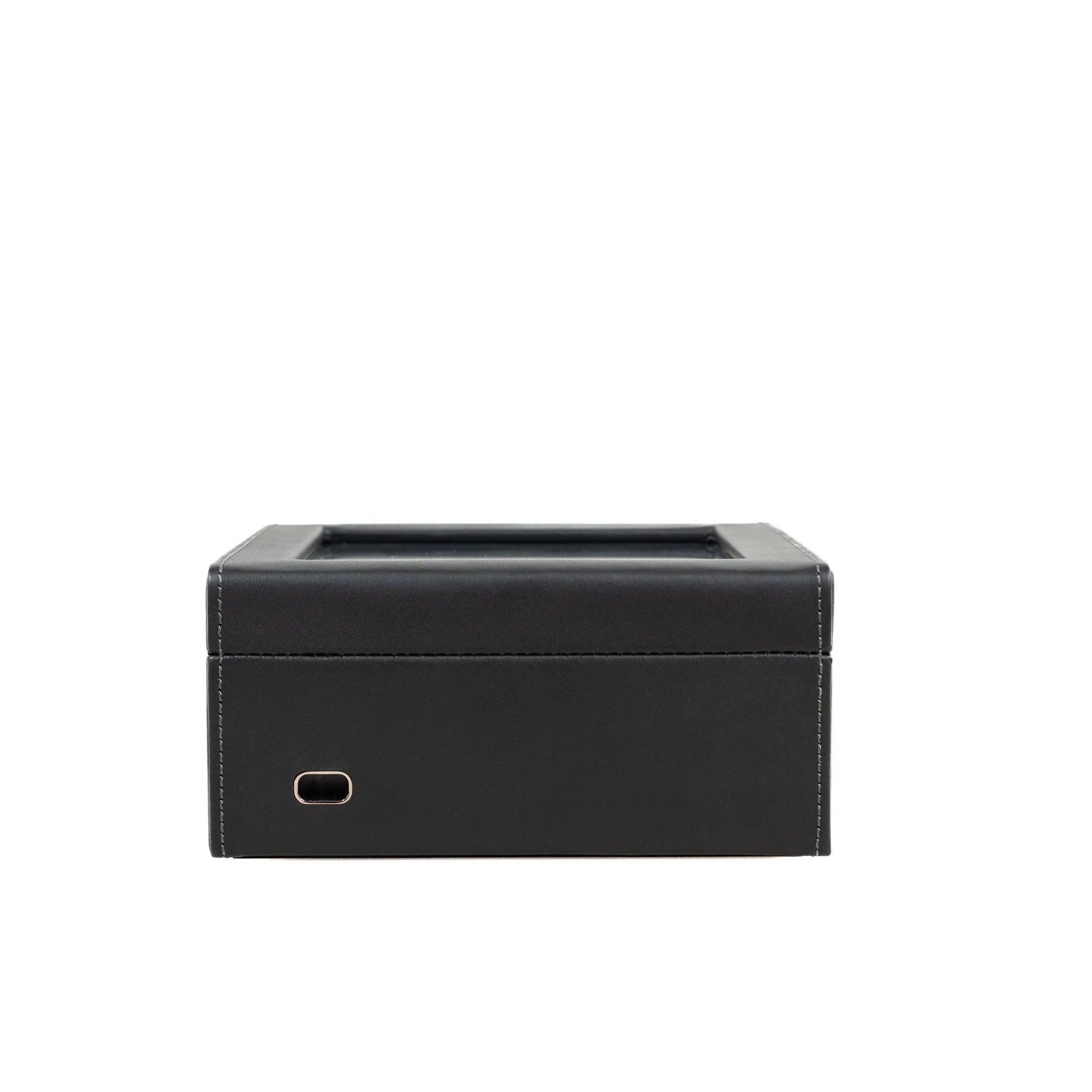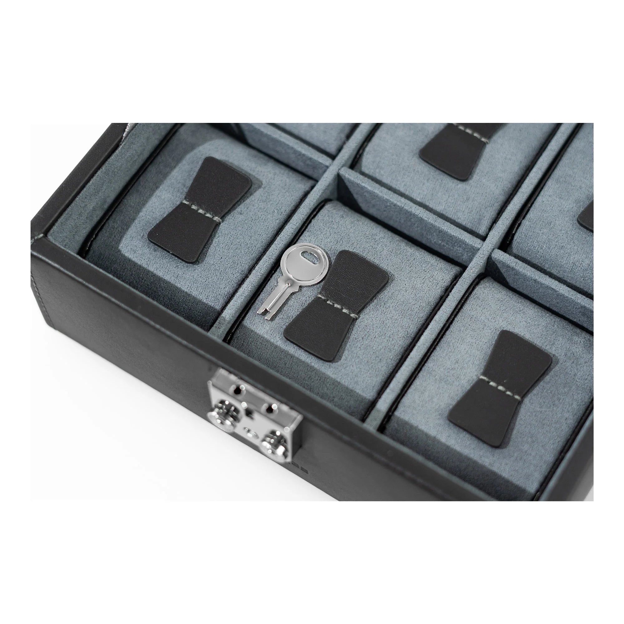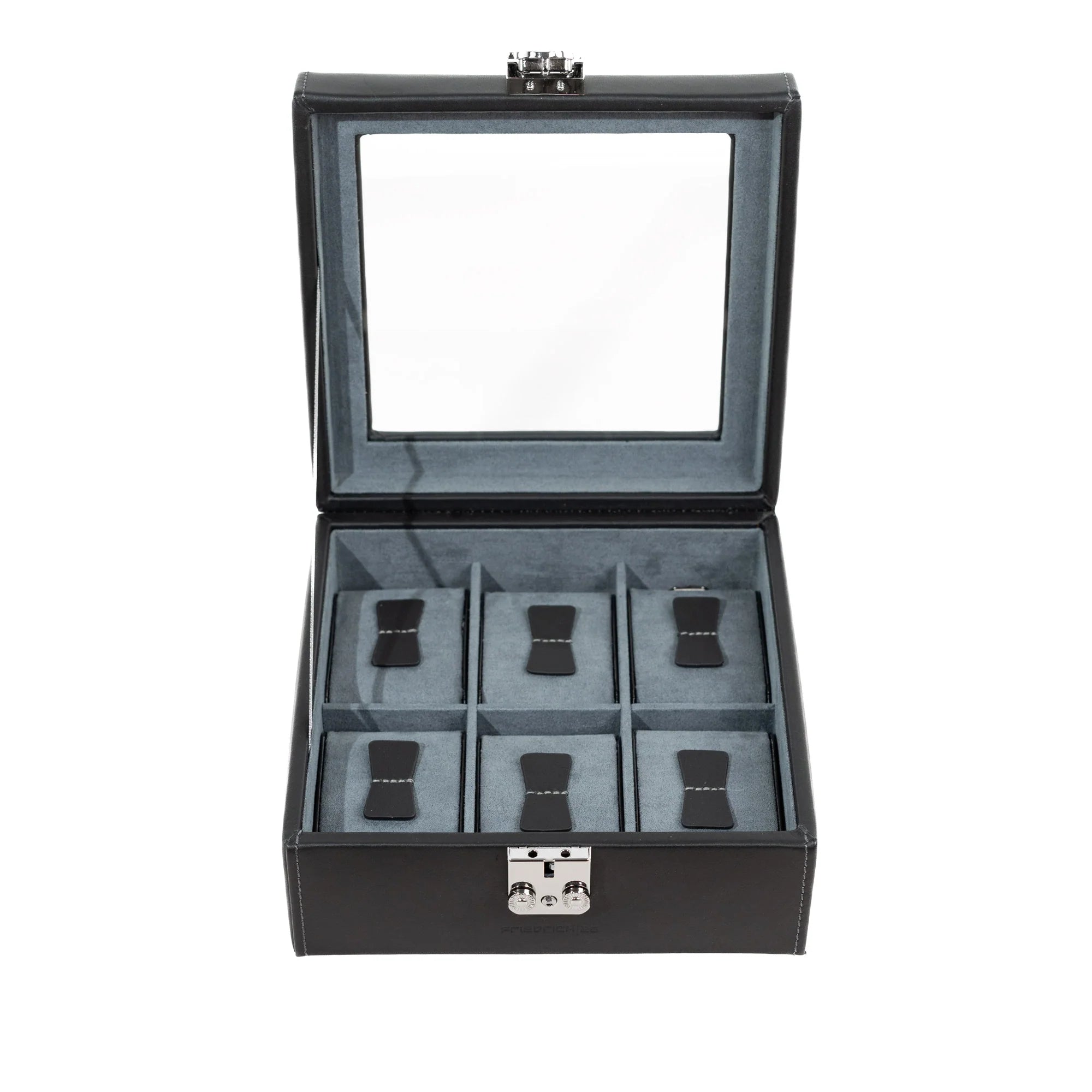 Dit is een vierkante en mooie lederen horlogedoos, die afsluit met een klikslot. Het heeft een fluweelzachte velours indeling met plaats voor 6 horloges. Er zijn kussentjes voorzien om de horloges op te bevestigen. Bovenaan is er een glazen deksel, zodat je je horloges altijd kan bewonderen. Het slot is afsluitbaar met bijgevoegd sleuteltje.