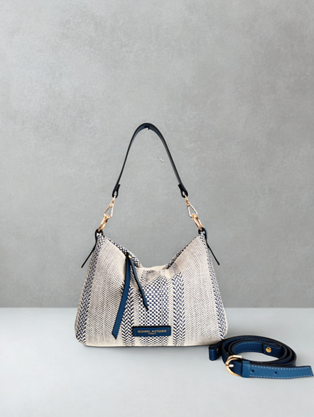 Het heeft een kort handvatje, dat je indien gewenst kan vervangen door de bijgevoegde lange riem (beide zijn afneembaar). Zo kan je deze tas op verschillende manieren dragen.