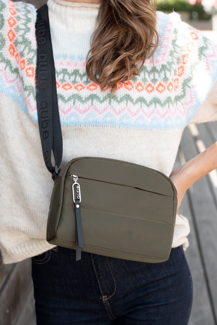 De tas combineert een moderne én tijdloze uitstraling met praktische details. De elegante schouderband, subtiel versierd met het ingeweven AUBE-logo, geeft je look een verfijnde en unieke finishing touch.